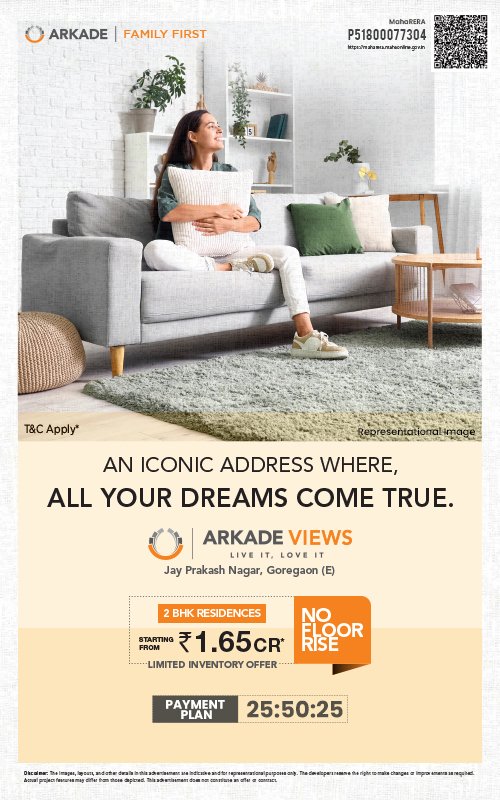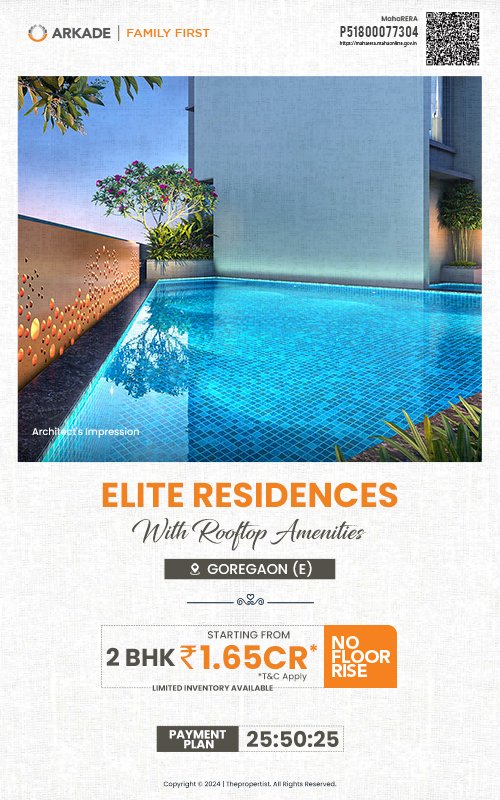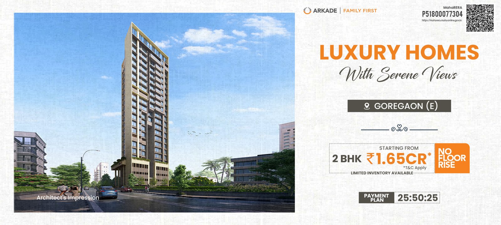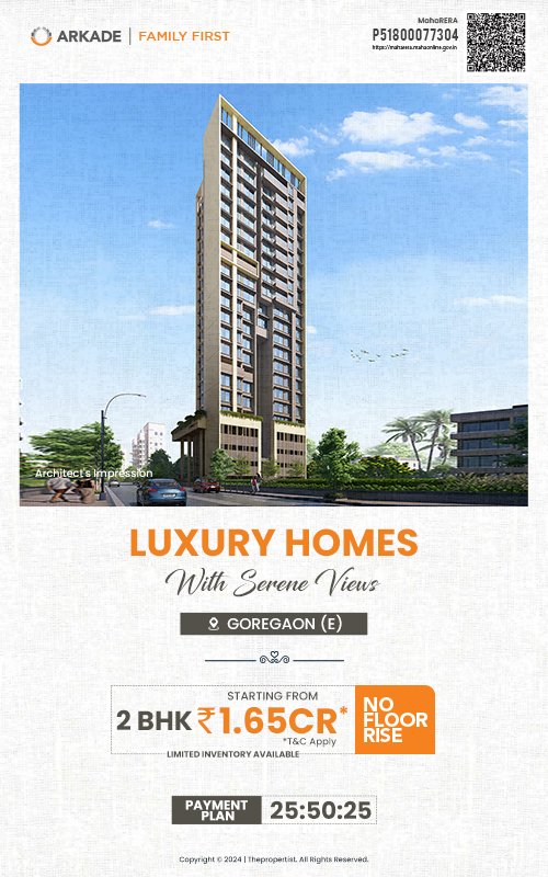 With excellent connectivity to Goregaon Station, Western Express Highway, and nearby malls, the project combines convenience with comfort. Arkade Views emphasizes creating homes where families can thrive, offering possession by December 2027.